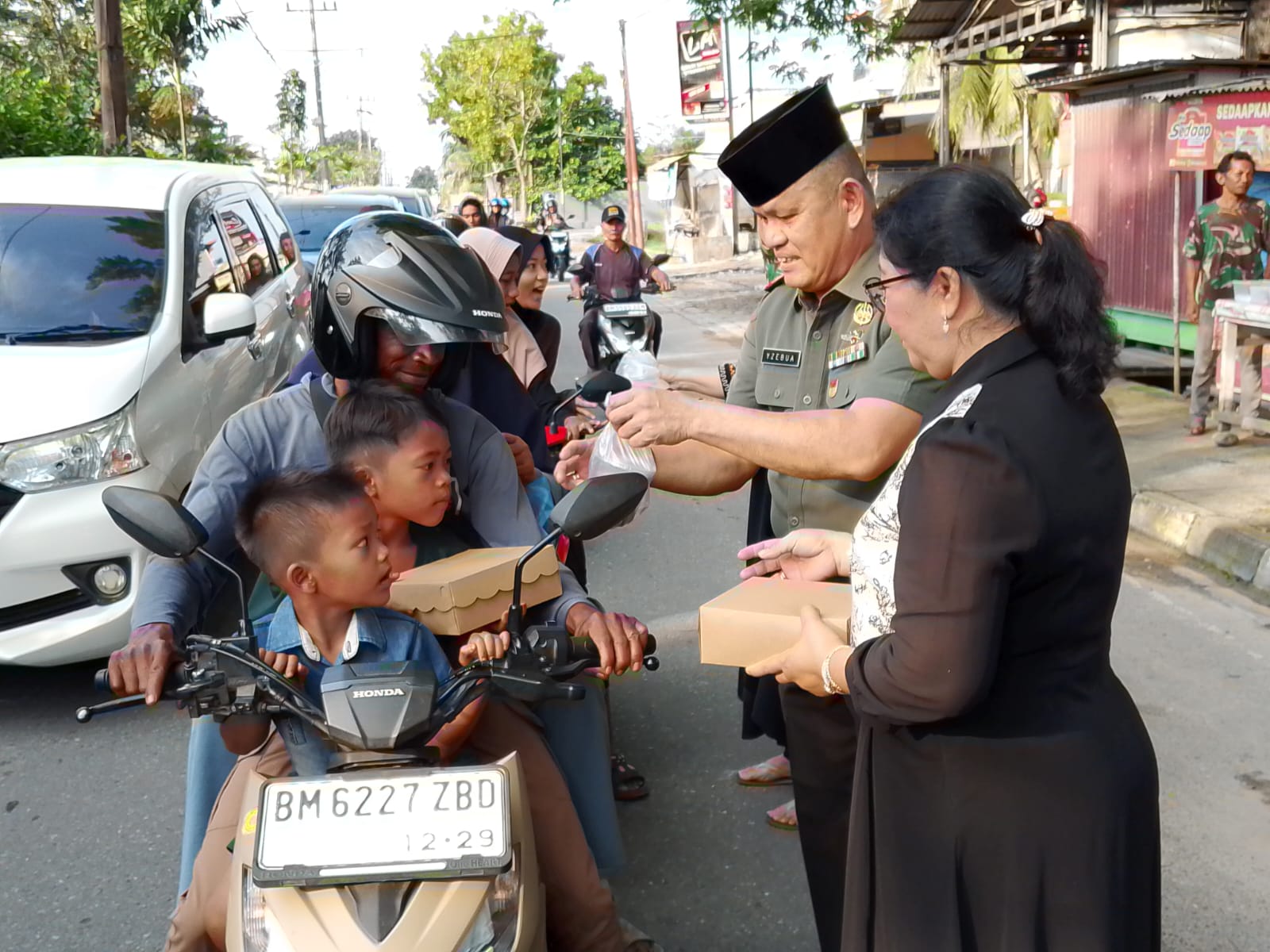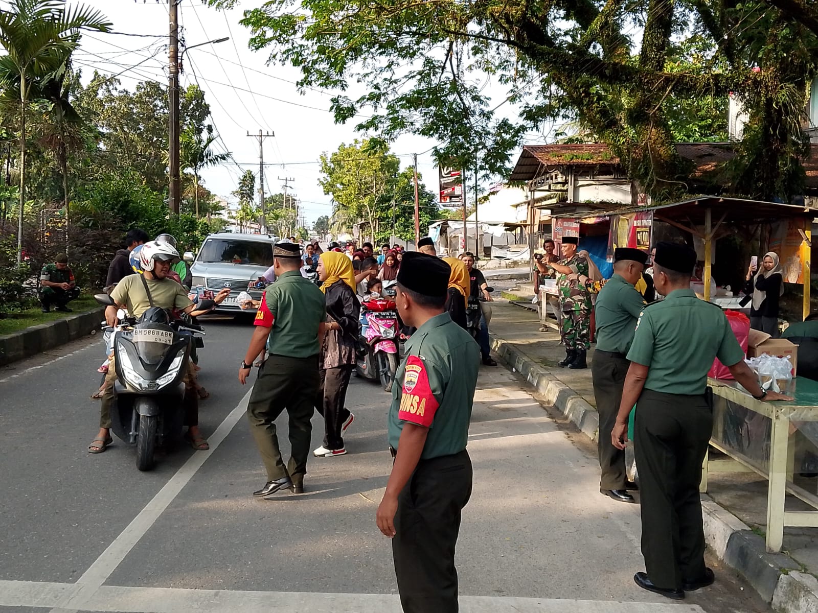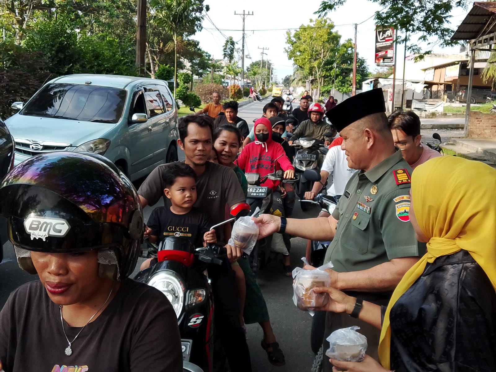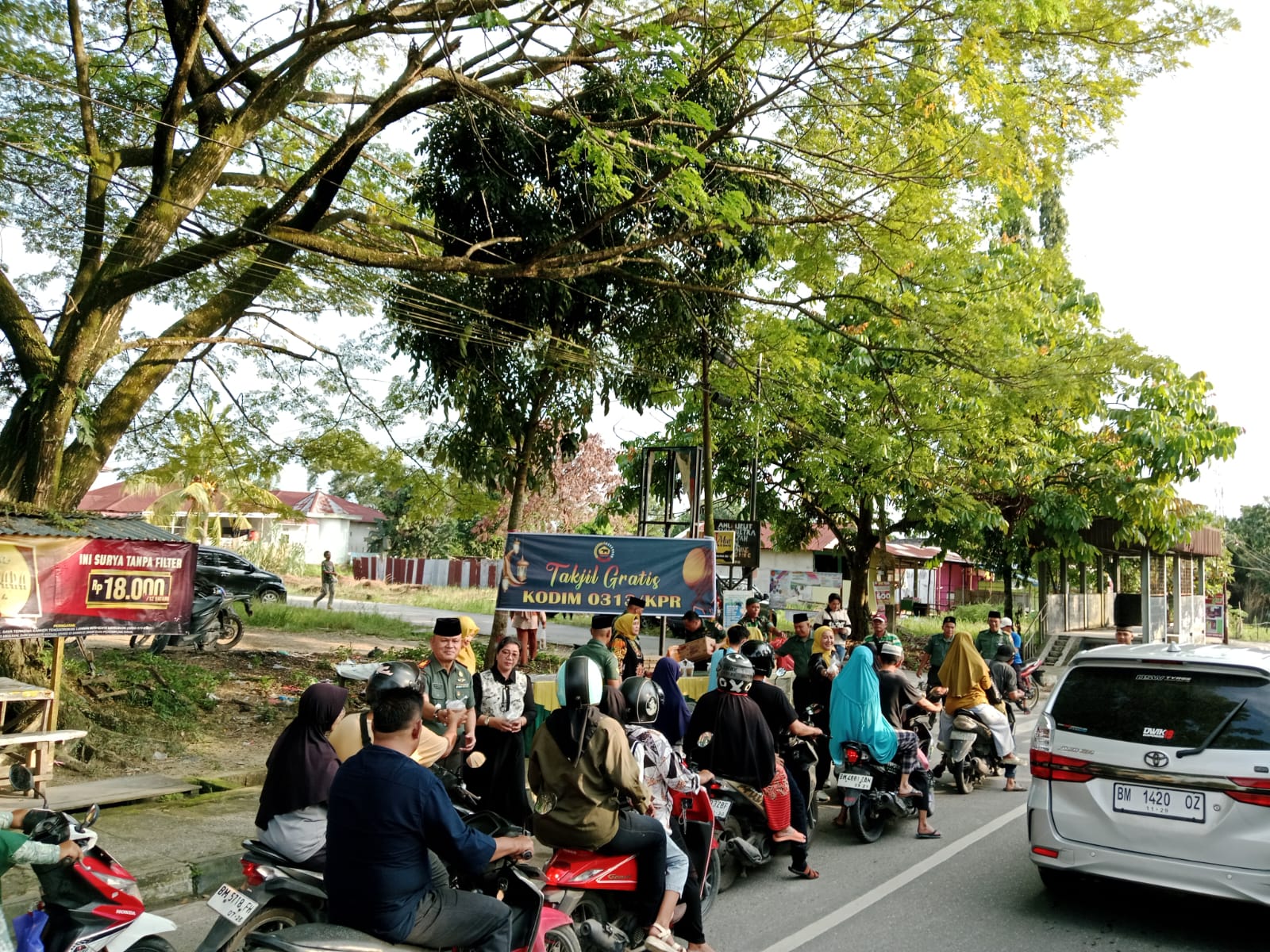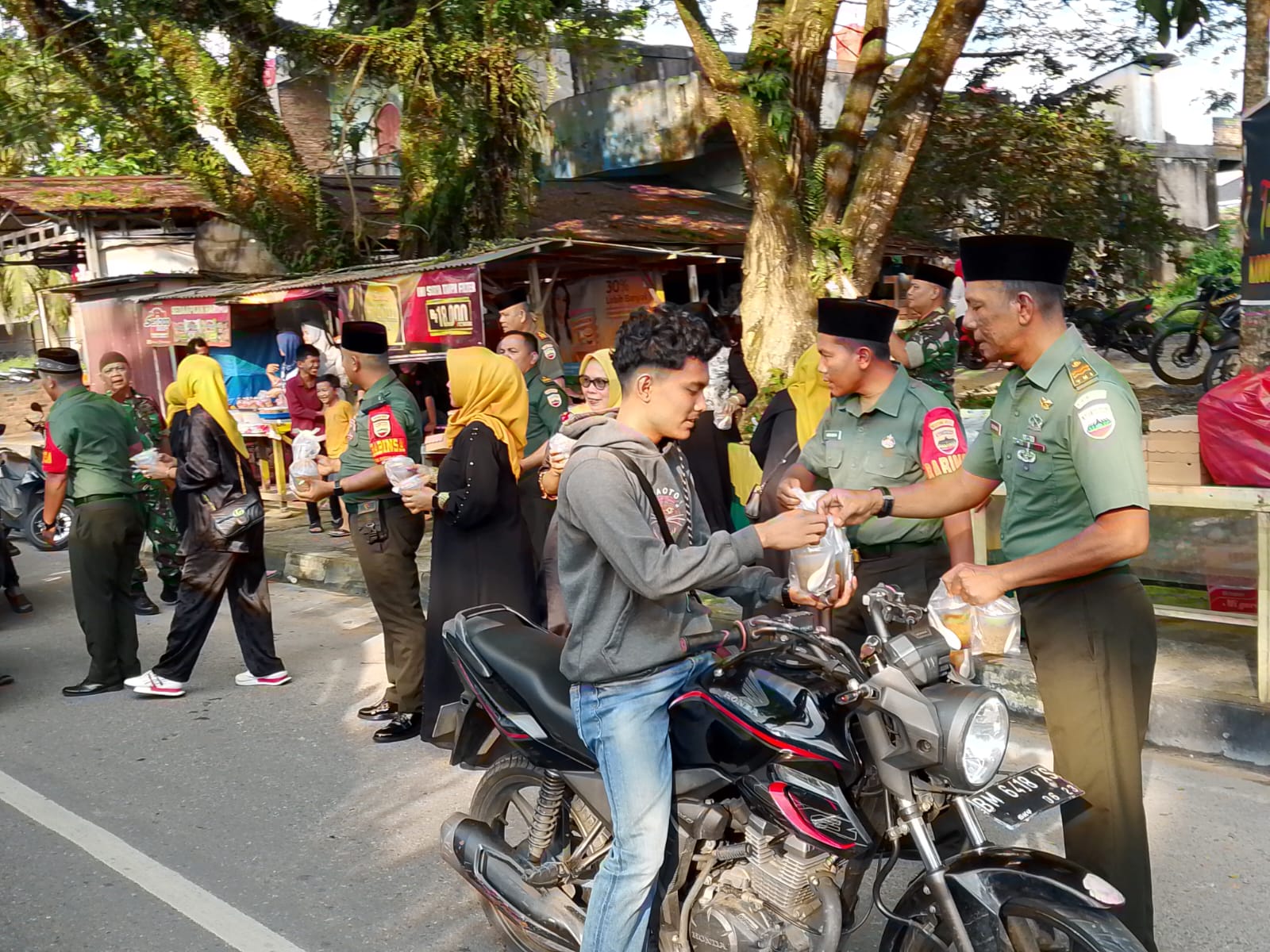 Kampar, Harimaupagi.com –Lagi Lagi.., Berkah Ramadhan dari Koramil 06/SH bersama Persit KCK Ranting 7 Mil 06/SH berbagi Takjil dan Nasi Kotak kepada Pengguna jalan Kaki, dan Kendaraan bermotor Roda 2. Berbagi Takjil dan Nasi kotak tersebut, di pimpin langsung Danramil 06/SH Kodim 0313/KPR Kapten Cba Y. Zebua. Kamis (20/3/2025)