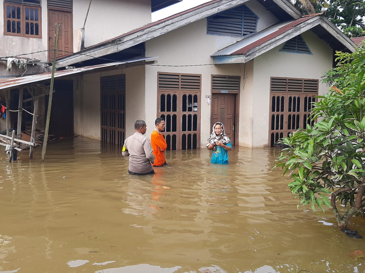 Saat ini air melintas suda H di atas badan jalan, di Dusun-I, II, III dan IV ketinggian air mencapai 2 Cm s/d 93 Cm dan sudah ada di perkirakan sebanyak 375 unit rumah terendam air dengan ketinggian air 3 Cm s/d 120 Cm dan 57 unit rumah warga sudah masuk kedalam rumah dengan ketinggian air di perkirakan 5 Cm s/d 73 Cm,” ucap Aipda Azani.