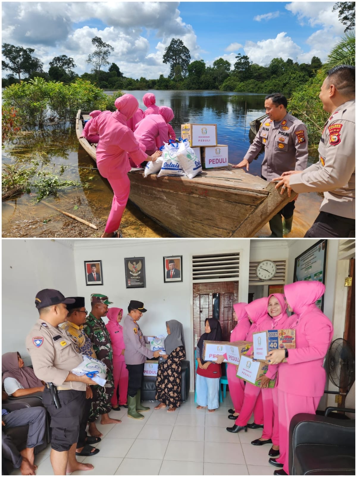 Ketua Bhayangkari Ny. Susi Elva Hendri bersama pengurus Ranting Polsek Kampar Kiri Hilir program “Bhayangkari Peduli” dengan mengendarai Perahu bersama Kapolsek Kampar Kiri Hilir AKP Elva Hendri S.H, M.H kunjungi rumah rumah warga yang terdampak banjir dan sekaligus memberi bingkisan berupa sembako dari “Bhayangkari Peduli” dari Polsek Kampar Kiri Hilir di desa Mentulik.