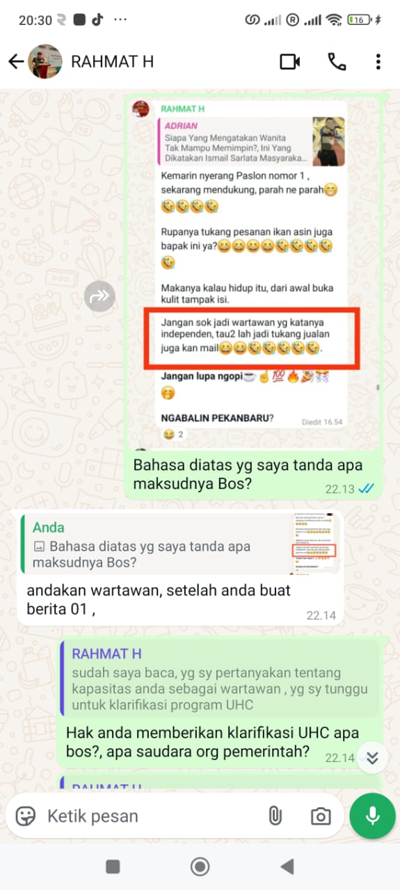 Anas menambahkan, tuduhan dan pencemaran nama baik korban ini dilakukan RH melalui WhatsApp Group “Forum Pekanbaru Bicara”‘ pada Sabtu (16/11) kemarin,” jelas Bowo pada media