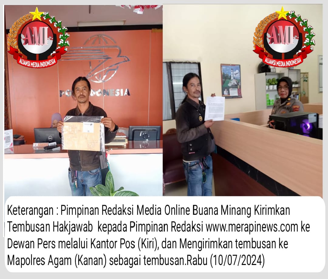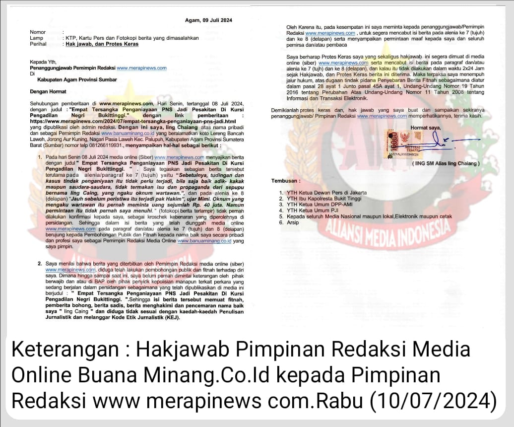 Iing chaiang dalam hal ini, telah melayangkan hak jawab sesuai dengan amanat Undang-undang No. 40 tahun 1999 tentang Pers. Dan telah dikirimkan kepada Pemimpin Redaksi dan penanggungjawab Merapinews.com dan tembusan kepada Dewan Pers, Ketua umum organisasi Pers Persatuan Jurnalis Indonesia (PJI), Ketua umum organisasi perusahaan Pers AMI (Aliansi Media Indonesia) dan kepada Ibu Kapolresta Bukittinggi, pada hari Rabu, 10 Juli 2024.