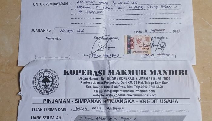 Kandis, Harimaupagi.com –Koperasi Simpan pinjam Makmur Mandiri yang berkantor di KM 73 jalan lintas Pekanbaru _ Duri,Kelurahan Telaga Sam-Sam, Kecamatan Kandis kabupaten Siak ,Perlu di pertanyakan legalitasnya apakah benar benar menjalankan aktivitasnya sesuai dengan undang-undang perkoperasian Nomor 25 Tahun 1992,apakah Koperasi Makmur Mandiri yang berkantor pusat di Ruko Suncity Square Blok A No 8-9,Jalan Hasibuan Kota Bekasi Jawa Barat ini digunakan oleh pimpinan pusat,Pimpinan Wilayah atau pimpinan unit menjadi alat melakukan penipuan terhadap Anggota maupun Masyarakat?