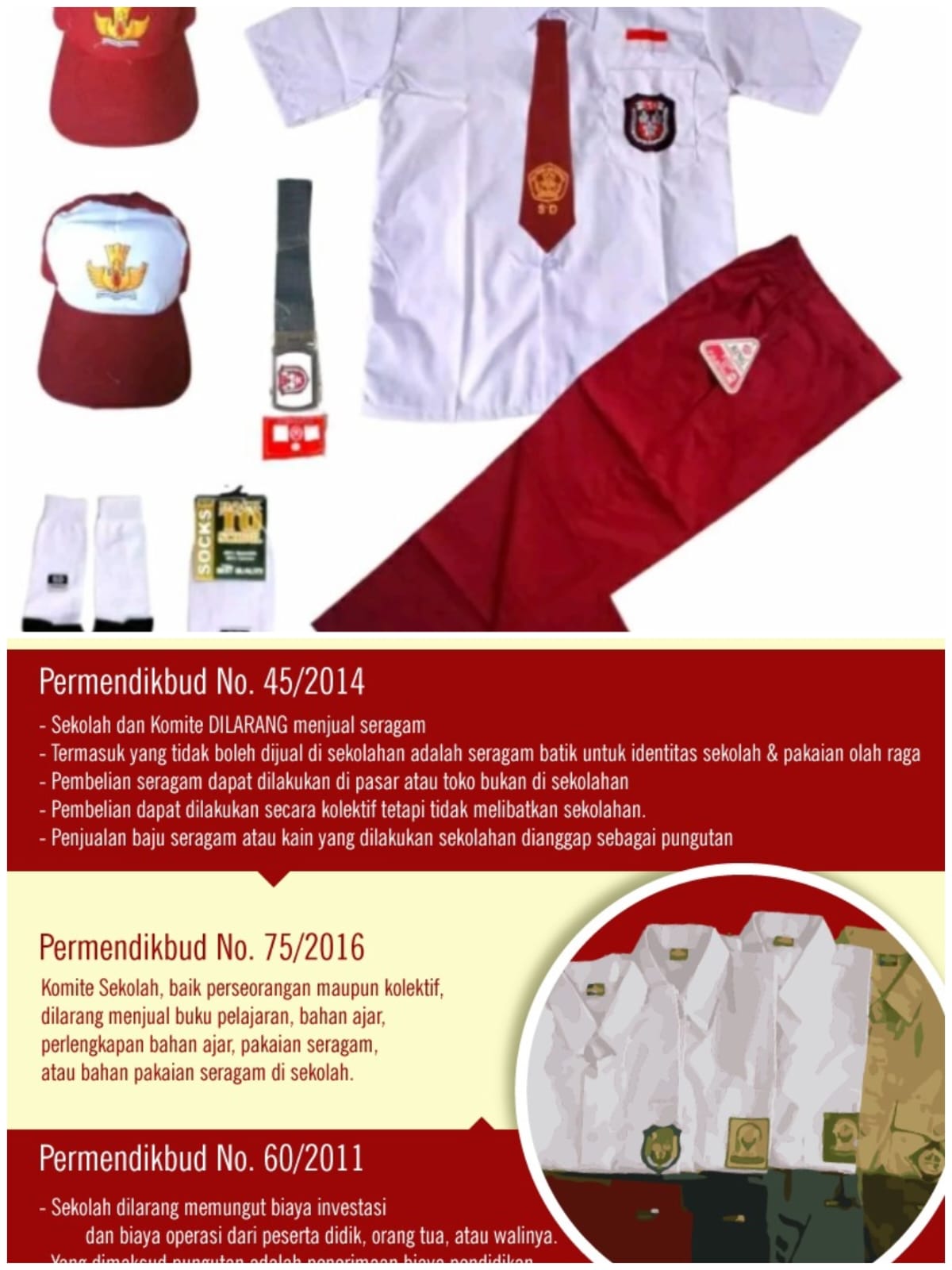 Selanjutnya tegas telah di atur pada Permendikbud nomor 45 tahun 2014 disebutkan, sekolah dan komite dilarang menjual seragam, termasuk tidak oleh dijual di sekolahan adalah seragam batik untuk identitas sekolah dan pakaian olahraga.