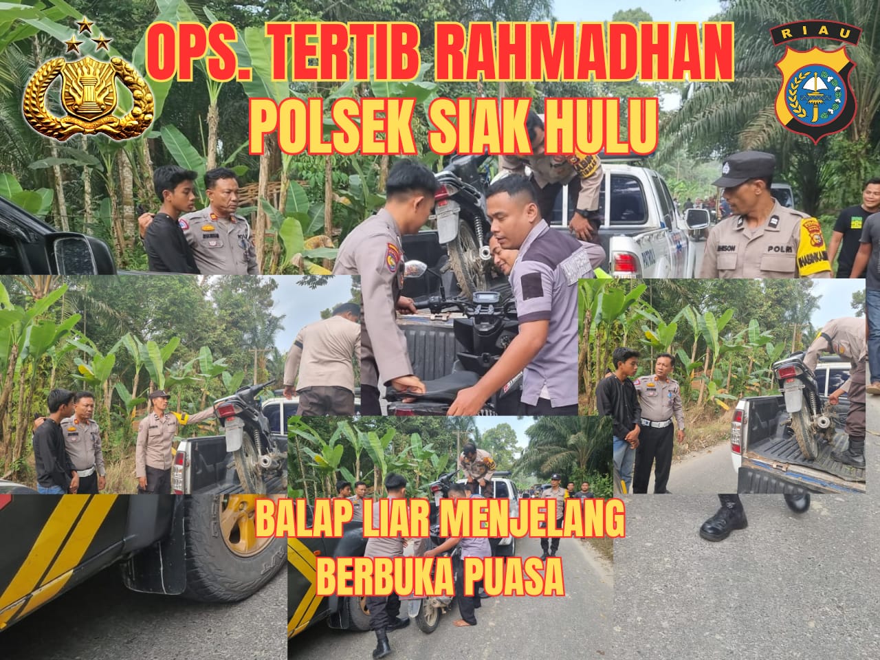 Kampar, Harimaupagi. com – Operasi (Ops) Tertib Ramadhan, dalam rangka menjaga Kamtibmas yang aman dan kondusif di wilayah hukum Polsek Siak Hulu, Kapolsek Siak Hulu AKP Asdisyah Mursyid S.H perintahkan Jajaran Polsek Siak Hulu laksanakan giat Rutin Patroli R4 sore hari di titik tempat yang berpotensi para remaja melakukan aksi balap liar seperti di Desa Lubuk Siam kecamatan Siak Hulu kabupaten Kampar. Jumat (15/3/2024)
