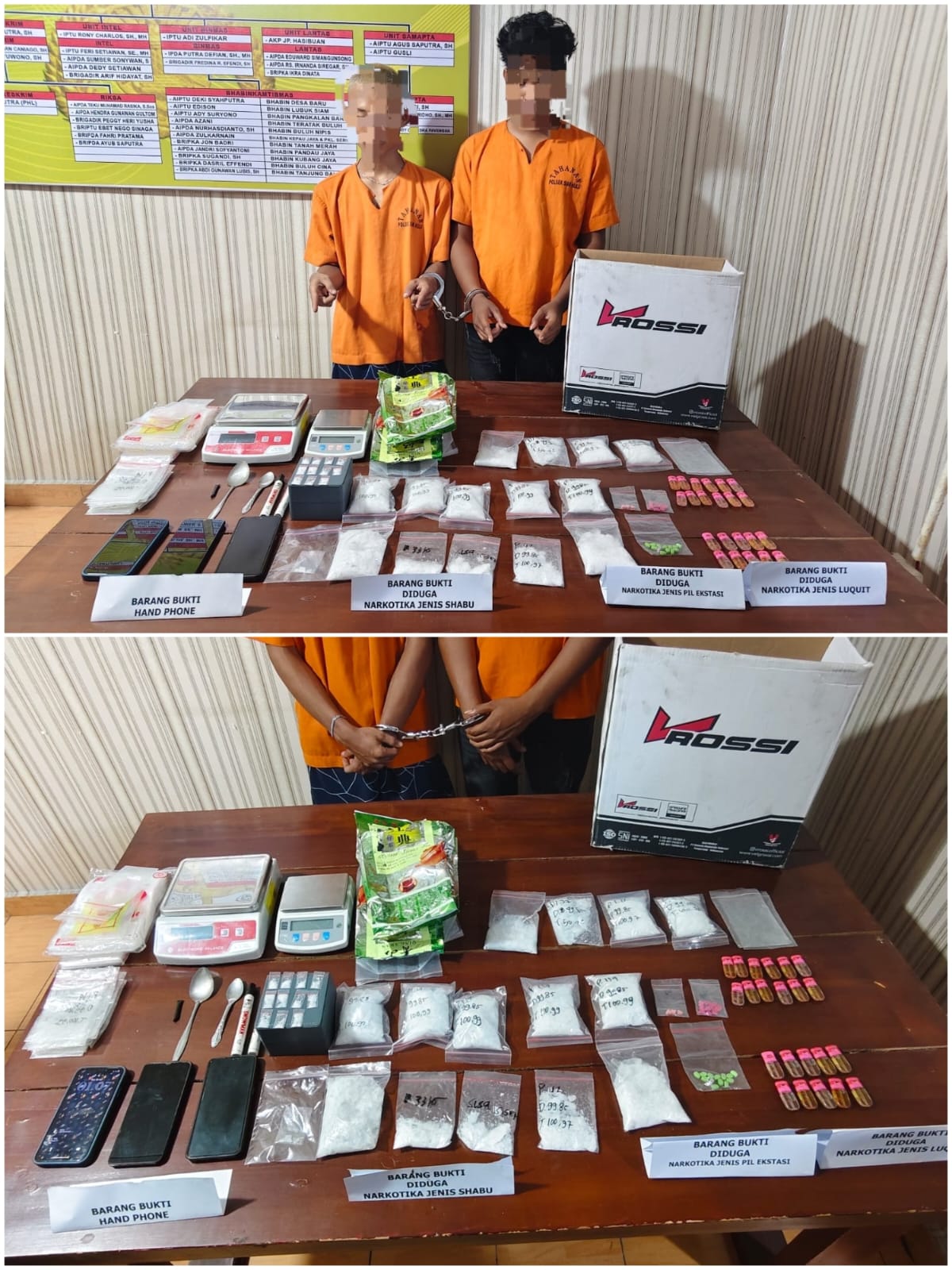 Selain sabu-sabu, turut diamankan 27 butir pil ekstasi berbagai merek dan warna, terdiri dari 12 butir ekstasi hijau merek Granat, 11 butir ekstasi pink merek Tengkorak, 3 butir ekstasi pink merek Superman, dan 1 butir ekstasi ungu merek Minion. Aparat juga menyita 22 botol cairan vape atau liquid yang termasuk dalam golongan narkotika jenis II, serta 2 unit timbangan yang ditemukan di kamar pelaku, dengan memperkuat dugaan bahwa keduanya aktif sebagai bandar.