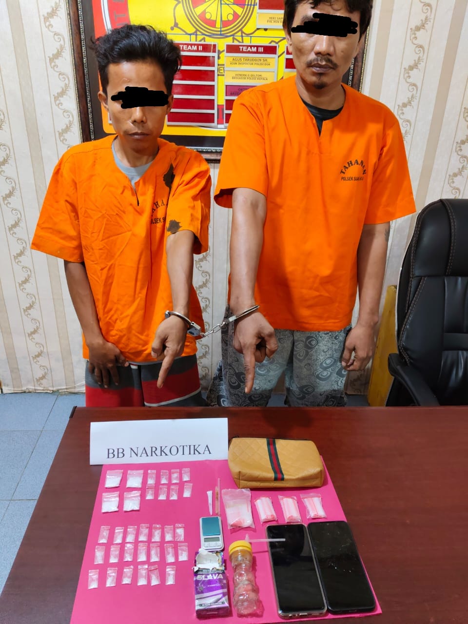 Kini ke 2 (dua) tersangka berikut barang bukti 4 (empat) paket sedang Narkotika jenis Sabu di bungkus plastik bening, 28 (dua puluh delapan) paket kecil Narkotika jenis Sabu di bungkus plastik bening, 4 (empat) bungkus plastik bening, 1 (satu) timbangan digital, 1 (satu) set alat isap Sabu (Bong) dan kaca pirex, 1 (sat) unit Handphone Ohonebmerek IPO Y27 warna biru dan 1 (satu) Hand Phone merek Samsung A04 warna hitam,” terang Kompol Pauzi, S H, M.H.