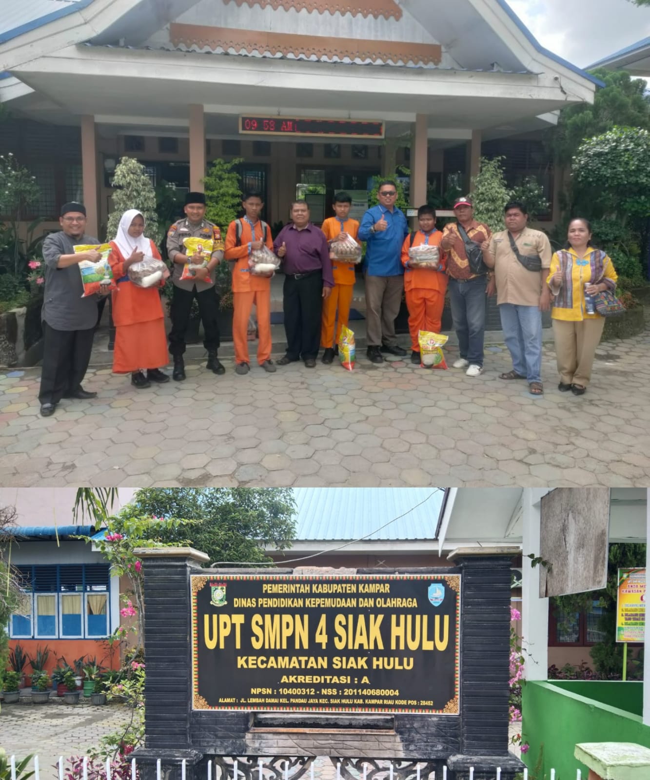 Berkesempatan pada Jum’at yang Berkah ini berbagi sembako kepada 5 siswa siswi yang kurang mampu bernama, Tiara Oktavia Waruhu Kelas VII-4, Samuel Prayogi Sihombing Kelas VII-5, Cindy Aulia Batubara Kelas VIII-3, Galih Rudi. F Kelas IX-1 dan Refian Syahruli Kelas IX-4 di SMPN 4 Siak Hulu.