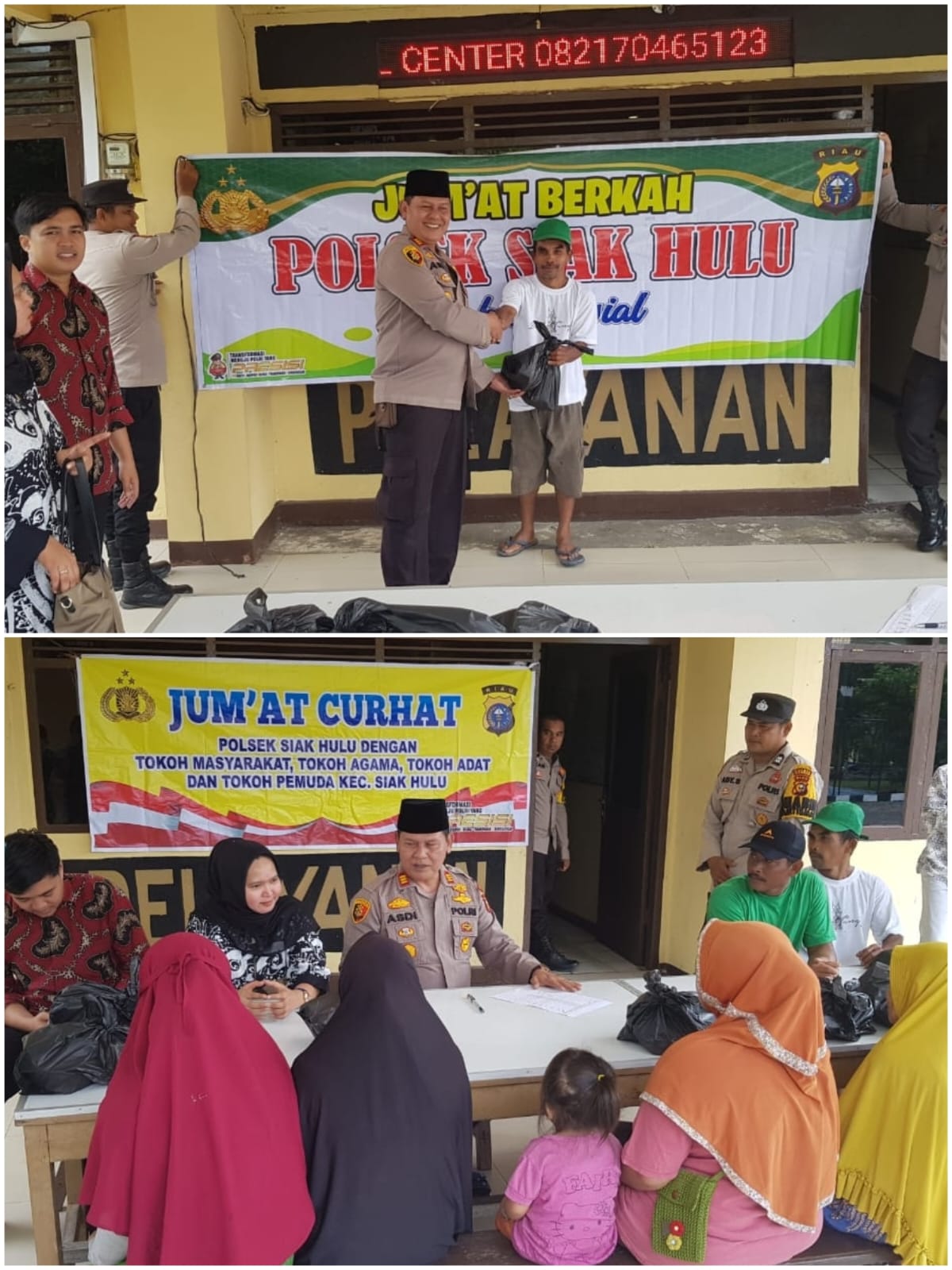 Kampar, Harimaupagi.com – Kegiatan rutin yang di laksanakan Polsek Siak Hulu setiap pada hari Jum’at, kali Kapolsek Siak Hulu AKP Asdisyah Mursyid SH bersama Jajaran anggota sekira pukul 10.00 Wib. Melaksanakan giat Jum’at Berkah dan Curhat di Bulan Suci Ramadhan 1445 H sekaligus berbagi sembako kepada 10 orang warga kurang mampu dan dilanjutkan giat Jum’at Curhat dengan memberikan Edukasi Kamtibmas. Jumat (22/3/2024)