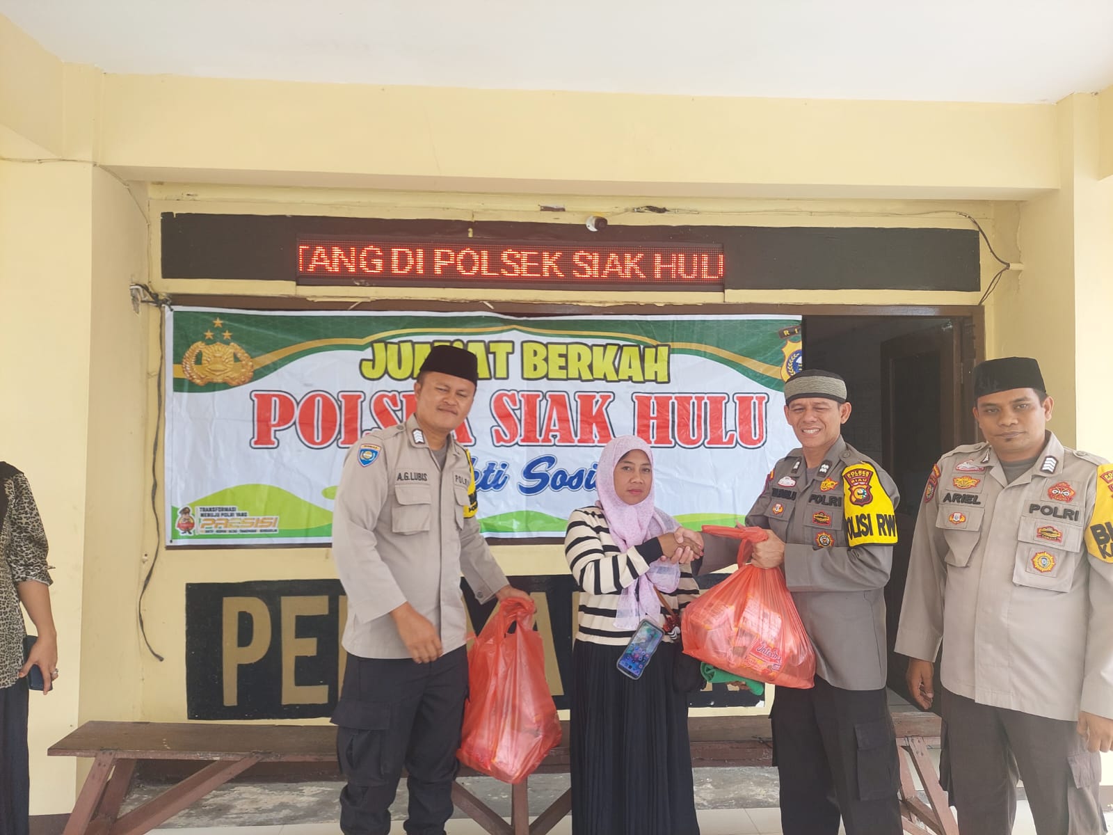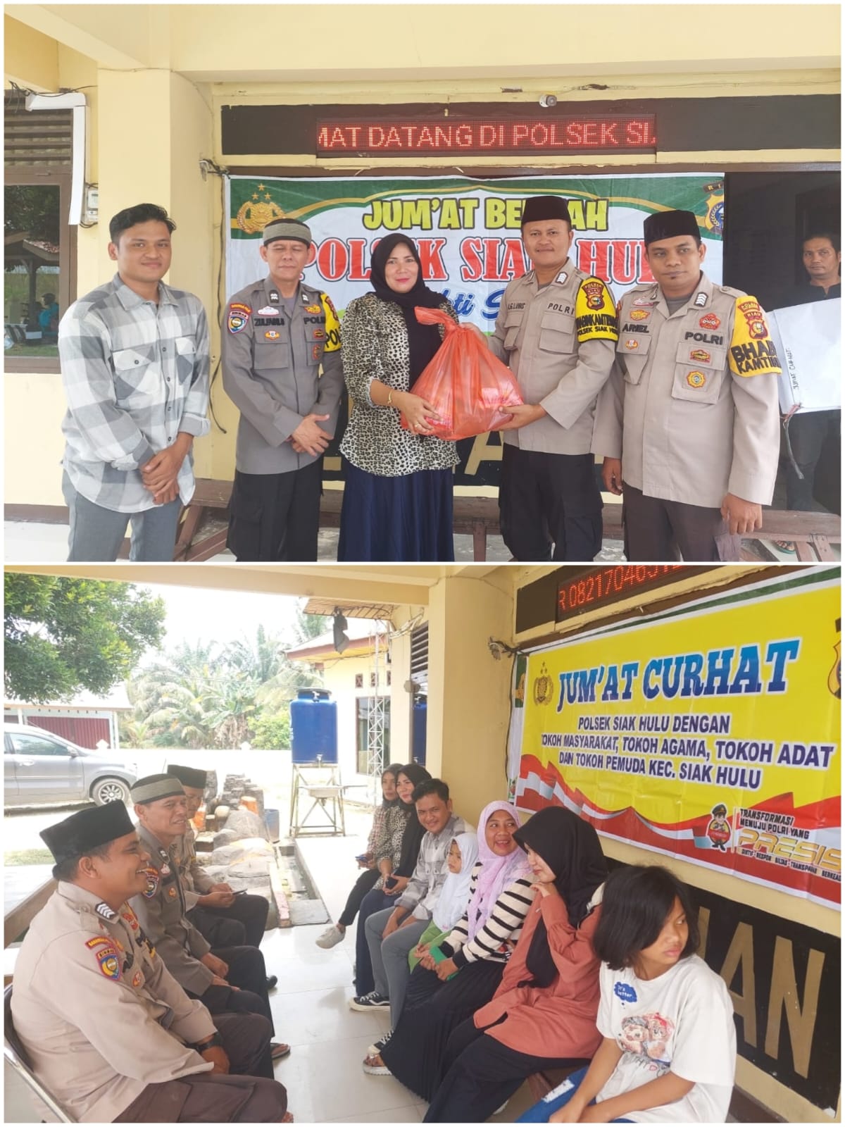 Kampar, Harimaupagi.com – Kegiatan rutin yang di laksanakan Polsek Siak Hulu setiap pada hari Jum’at, kali Kapolsek Siak Hulu AKP Asdisyah Mursyid SH yang diwakili jajaran anggota sekira pukul 09.30. Wib. Melaksanakan giat Bakti sosial berbagi sembako kepada 5 orang warga kurang mampu dan dilanjutkan giat Jum’at Curhat sekaligus memberikan Edukasi Kamtibmas pada pukul 10.00 Wib sampai dengan selesai. Jumat (15/3/2024)