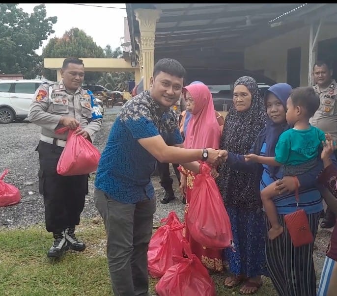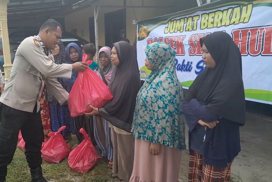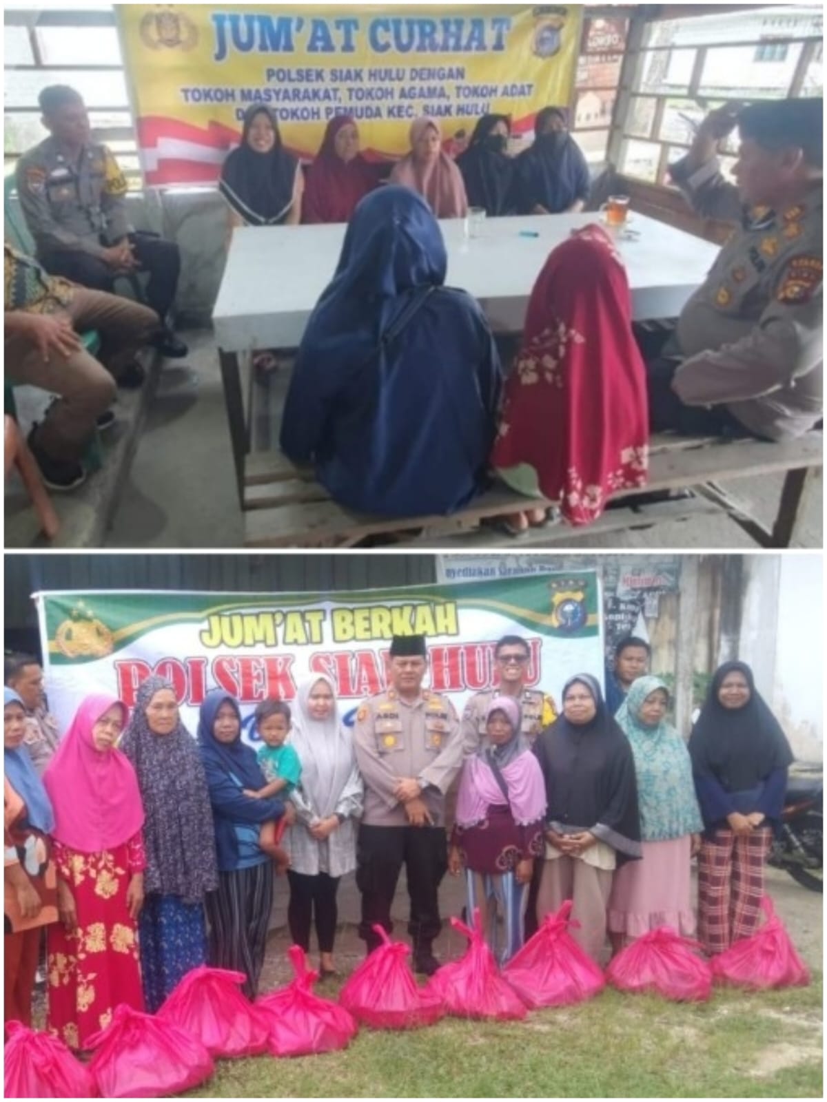 Kampar, Harimaupagi.com-Kegiatan rutin yang di laksanakan Polsek Siak Hulu setiap pada hari Jum’at, kali Kapolsek Siak Hulu AKP Asdisyah Mursyid SH berserta jajaran anggota dan PT. Agung Bumi Lestari (ABL) sekira pukul 10.30. Wib. Melaksanakan giat Bakti sosial berbagi sembako kepada 10 orang warga kurang mampu dan dilanjutkan giat Jum’at Curhat sekaligus memberikan Edukasi Cooling System Pemilu Damai pada pukul 11.00 Wib sampai dengan selesai. Jumat (2/2/2024)
