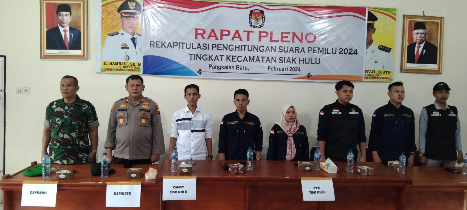 Sekira pukul 09.30 Wib, Camat Siak Hulu Irwansyah S.STP secara resmi membuka Rapat Pleno dan Rekapitulasi Perhitungan Suara Pemilu 2024 yang di hadiri Kapolsek Siak Hulu AKP Asdisyah Mursyid S.H, Danramil 06/Siak Hulu Kapten Cba Y. Zebua diwakili Peltu Ramadhan, Ketua PPK Siak Hulu Edi Efendi berserta Anggota, Ketua Panwascam Siak Hulu Alfedry Putra beserta Anggota dan para saksi Partai Politik.