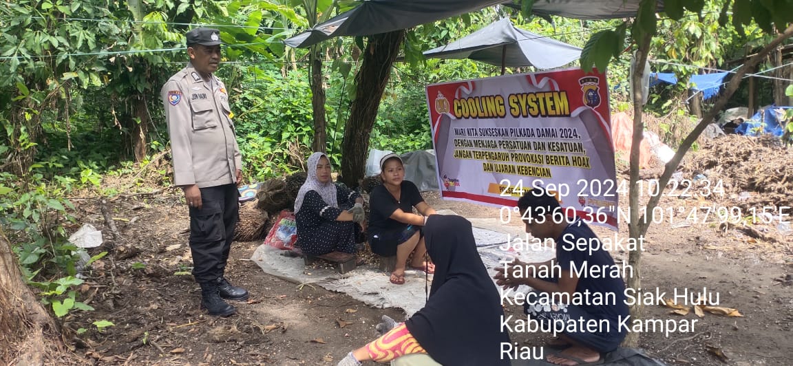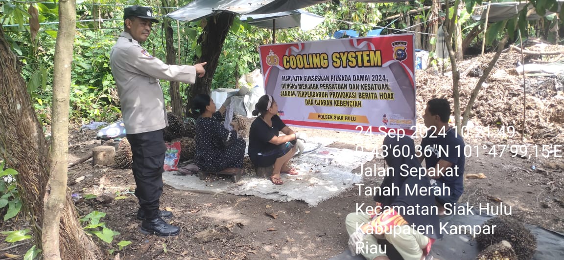 Kampar, Harimaupagi.com – Kapolsek Siak Hulu AKP Asdisyah Mursyid, S.H perintahkan Unit Binmas melaksanakan “Cooling System” menjelang Pilkada serentak di seluruh NKRI. Saat ini Polri terus melaksanakan giat Cooling System di berbagai daerah. Begitu juga Polsek Siak Hulu juga ambil bagian ikut melaksanakan Cooling System, khususnya di kecamatan Siak Hulu.