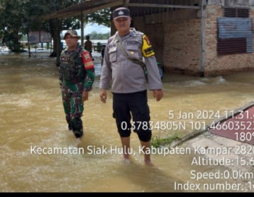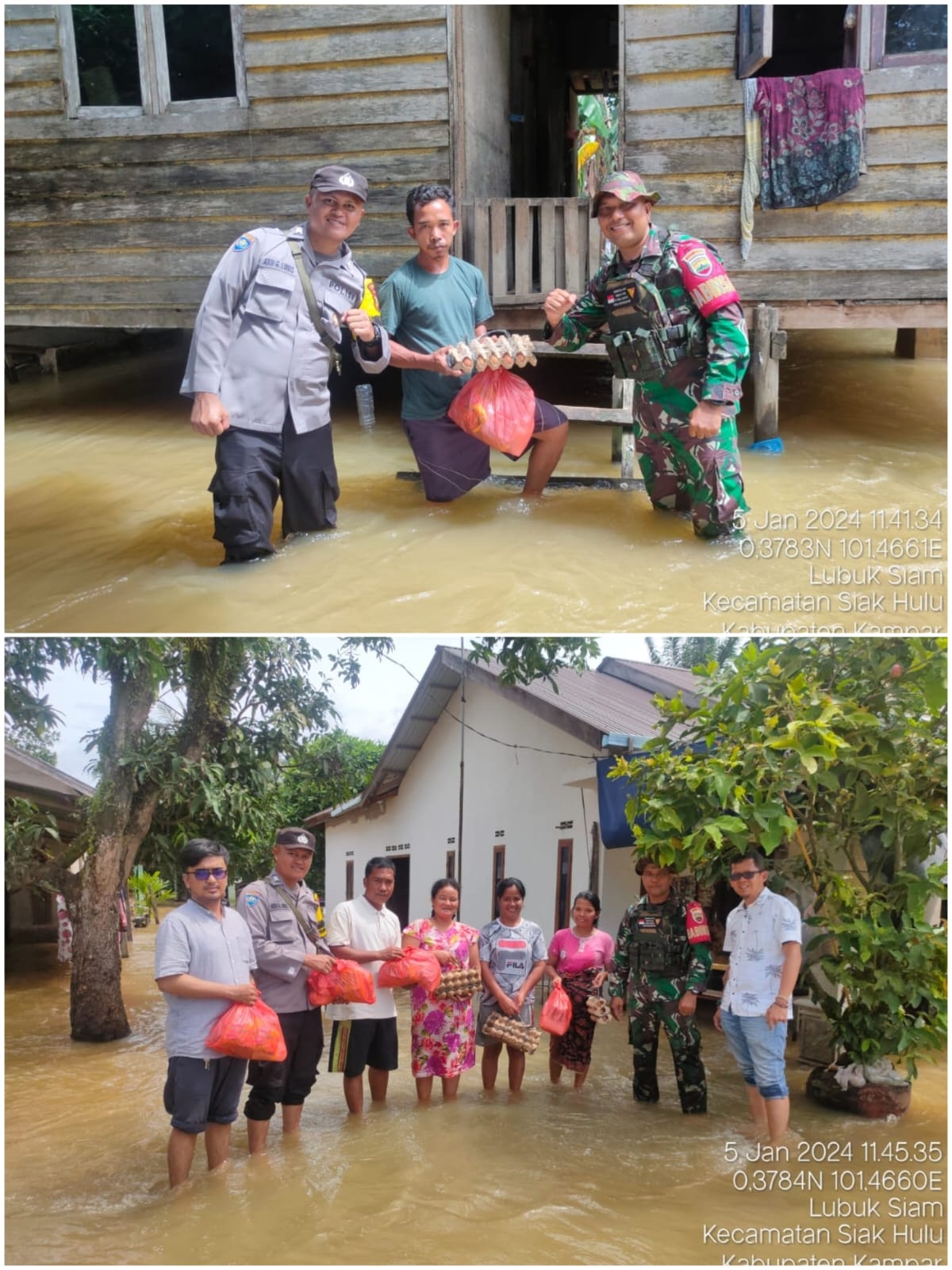 Bhabinkamtibmas Polsek Siak Hulu yang bertugas di Desa Tanjung Balam Bripka Abdi Gunawan Lubis S.H bersama Babinsa Koramil 06/Siak Hulu Serda Fadli Nasution yang juga bertugas di Desa Lubuk Siam. Kedua personel anggota ini bersinergi membantu para warga yang terkena dampak banjir di Dusun-I, II, III dan Dusun IV Desa Tanjung Balam kecamatan Siak Hulu kabupaten Kampar. Jum’at (5/1/2024).