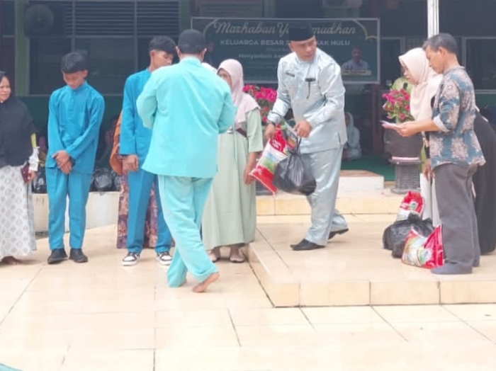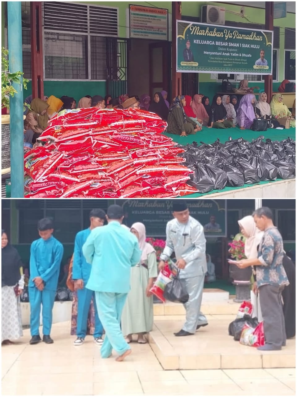 “Alhamdulillah, keluarga besar SMAN 1 Siak Hulu tahun ini memberikan Santunan kepada siswa siswi sebanyak 86 orang dan tanpa terkecuali baik yang Muslim maupun Non Muslim. Santunan kami berikan dengan masing masing penerima santunan berupa 1 Karung Beras, 1 Papan Telur, 1 Kg Minyak Goreng, 1 Kotak Bubuk Teh dan Kopi, 1 Botol Syrup dan uang tunai Rp. 150 Ribu,” terang Drs. Andi Surya