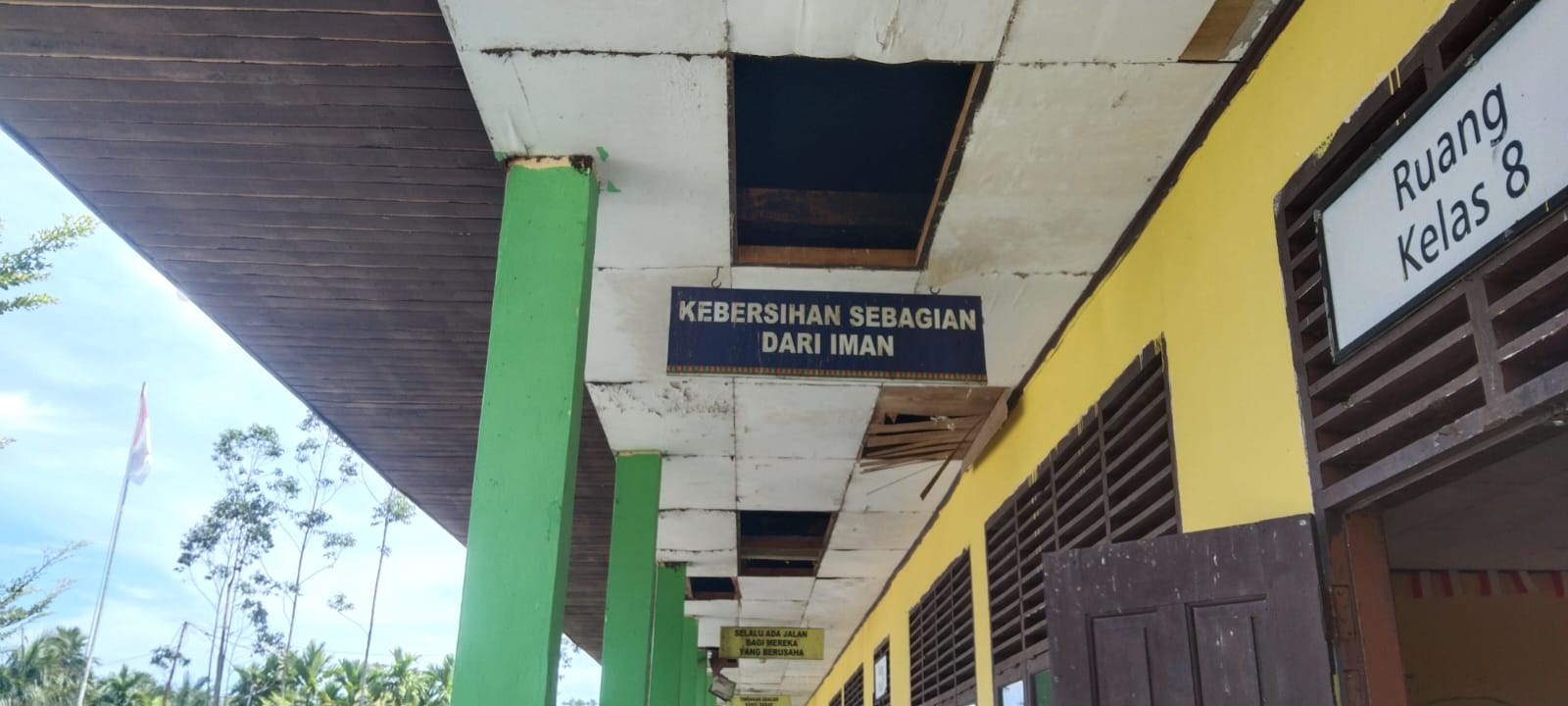 Lanjutnya lagi, sekarang 1 ruang UKS sudah tidak terpakai lagi karena Plafon ruangan sudah jebol jebol dan berjatuhan dan 3 ruang untuk RKB juga plafonnya banyak yang jebol berjatuhan dan lantainya masih terbuat dari semen bukan keramik,” jelasnya