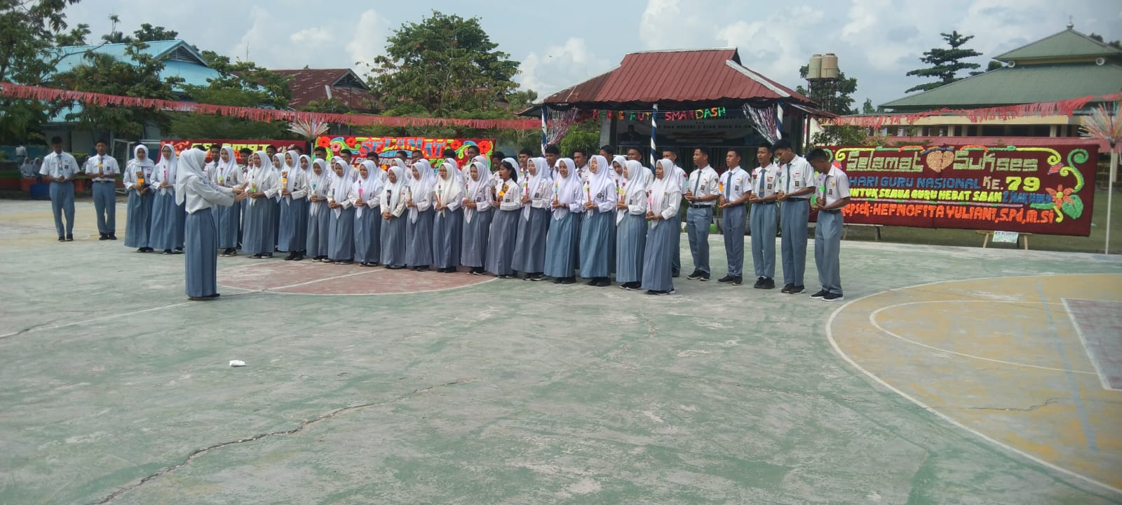 Kepala SMAN 2 Siak Hulu Hefnofita Yuliani, S.Pd, M.Si selaku pembina upacara menyampaikan teks amanat Menteri Pendidikan Dasar dan Menengah (Mendikdasmen). Melalui teks tersebut, Hefnofita Yuliani, S.Pd, M.Si mengucapkan selamat Hari Guru Nasional untuk para guru di seluruh tanah air, baik yang mendidik di kota kota besar, satuan pendidikan yang ternama maupun mereka yang mengabdi di pelosok desa pada satuan pendidikan dengan fasilitas, sarana prasarana pendidikan terbatas. Semuanya ini merupakan tugas mulia mencerdaskan dan memajukan bangsa,” Hari Guru tahun ini mengambil tema “Guru Hebat Indonesia Kuat,” kata Hefnofita Yuliani