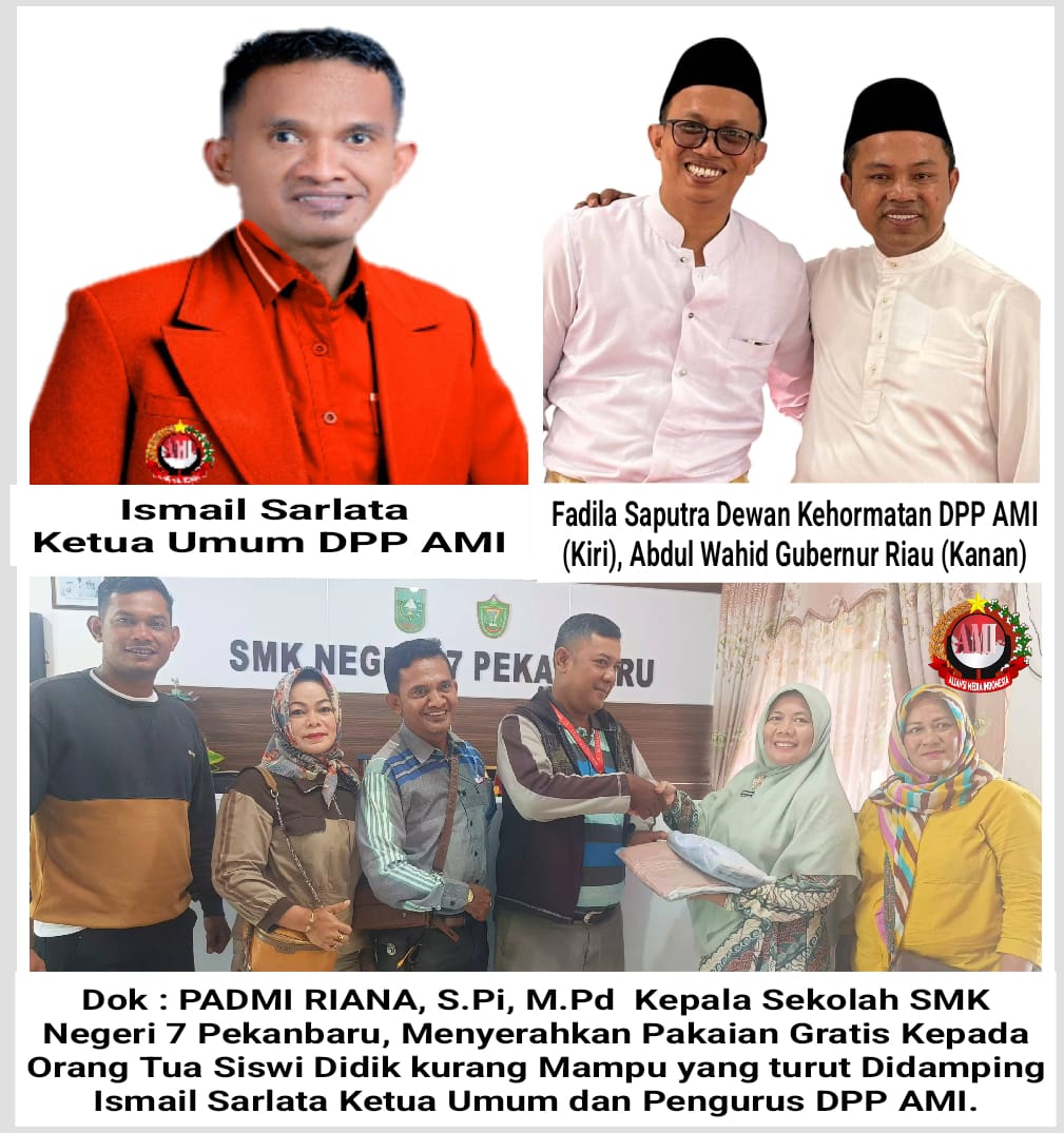 Ucapan terimakasih Pengurus, dikarenakan akan respon baik yang diberikan oleh Pak Abdul Wahid Gubernur Riau melalui Fadila Saputra selaku Dewan Kehormatan DPP AMI. Dimana kami pengurus mendapatkan laporan dari masyarakat,adanya siswi yang tidak mampu untuk menjalankan kewajiban orang tuanya untuk membeli pakaian seragam dikarenakan orang tuanya bekerja seharian sebagai Ojol dan/atau Tukang Ojek.