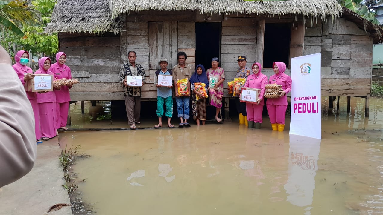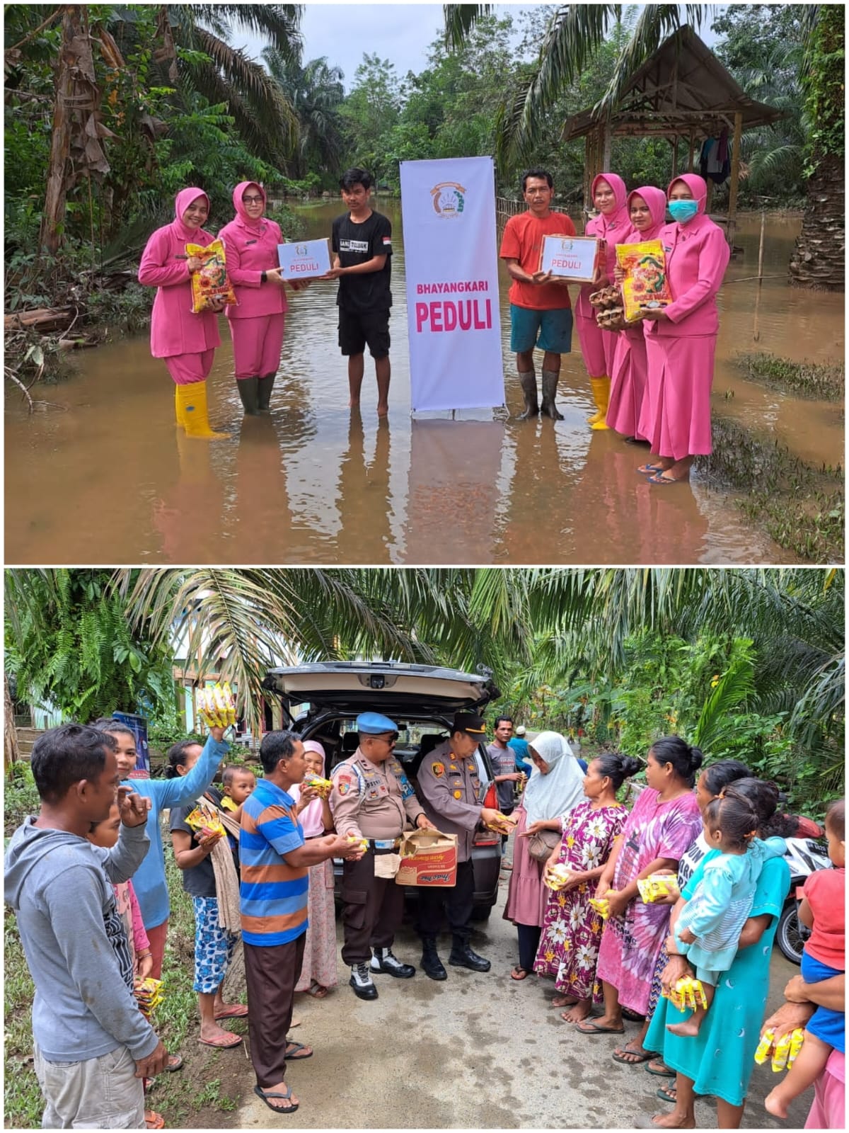 Pada kesempatan ini Bhayangkari Peduli, Ketua Bhayangkari Ranting Polsek Pangean berserta pengurus dan di dampingi Kapolsek Pangean AKP Zulfatriano S.H, M.H memberikan bantuan sembako kepada warga yang terdampak banjir, masing masing 1 Paket berupa Beras, Gula, Minyak Goreng, Bubuk Teh, Ikan