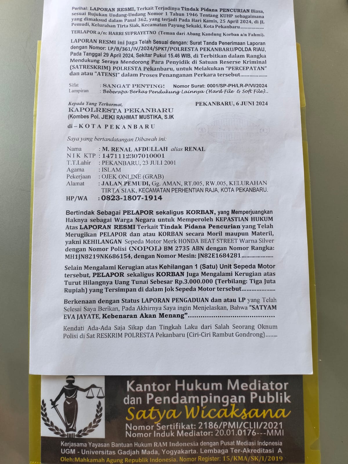 Adalah M Renal Afdullah alias Renal, Driver Ojek Online yang juga Adik Kandung dari salah seorang Wartawan di Kota Pekanbaru, tertimpa musibah di rumahnya sendiri. Sepeda Motor yang ditinggal sebentar saja Lenyap di Curi oleh Terlapor atas nama Harri Suprayetno.