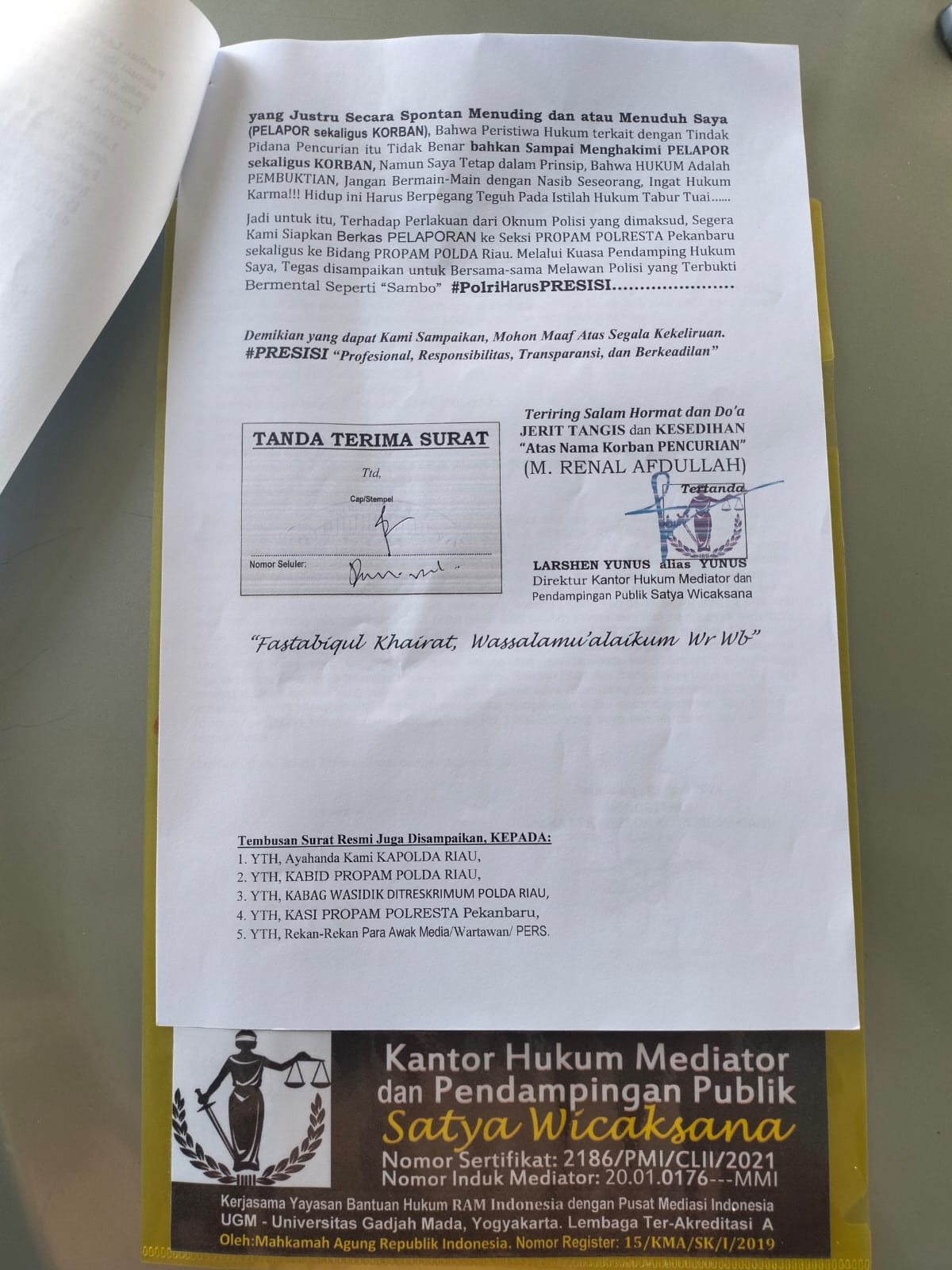 “Laporan Polisi (LP) telah kami sampaikan dan hingga saat ini, Sabtu (8/6/2024) Penyidik di Satuan Reserse Kriminal (Satreskrim) Polresta Pekanbaru belum juga menemui titik terang” ungkap Larshen Yunus.