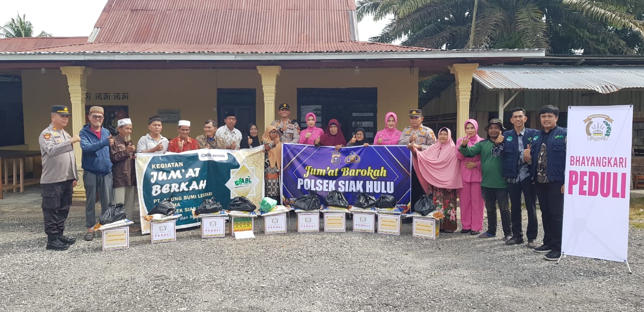 Kegiatan Jumat Berkah, Jumat Curhat dan Bhayangkari Peduli di hadiri, Kapolsek Siak Hulu Kompol Pauzi, S.H.,M.H, Waka Polsek Siak Hulu AKP Yulius, S.Psi, Para Kanit / Panit dan anggota Polsek Siak Hulu, Ketua Ranting Bhayangkari Siak Hulu Ny. Ekha Pauzi, Para pengurus ranting dan anggota Bhayangkari Polsek Siak Hulu, Humas PT. Agung Bumi Lestari (ABL) Sdr. M Syarif didampingi staf, Penceramah agama oleh Al-Ustad Nofriadi, S.Ag, Ketua RT.04 Dsn.I Ibu Neneng, 10 orang warga penerima bantuan dari Dsn.1 Desa Baru Kecamatan Siak Hulu.A