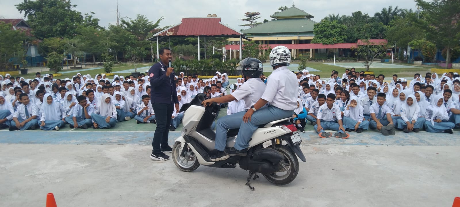 Perlu kita praktekkan bagaimana berkendara yang baik, seperti sebelum mengendarai kendaraan kita perlu memeriksa perlengkapan kendaraan. Seperti Ban kendaraan, klakson, Rem, Kaca Spion dan Helm. Setelah kita beri contoh dengan memberi peraga oleh 2 orang siswa, disini kami berikan tata cara berkendara yang baik, berkendaraan sendiri maupun berboncengan,” jelas Pramudia Nugraha