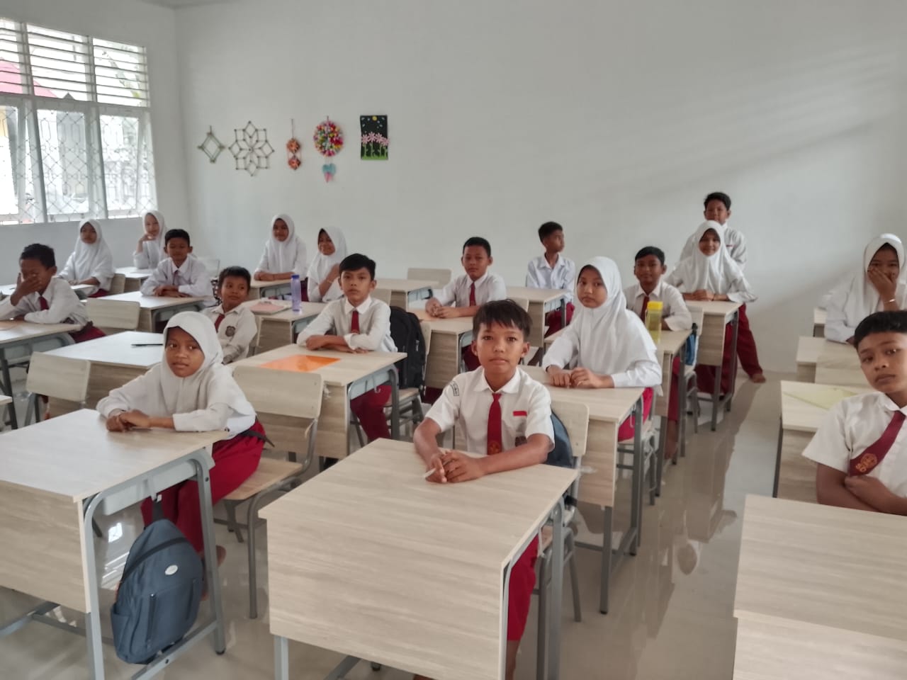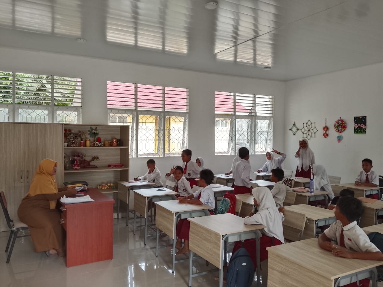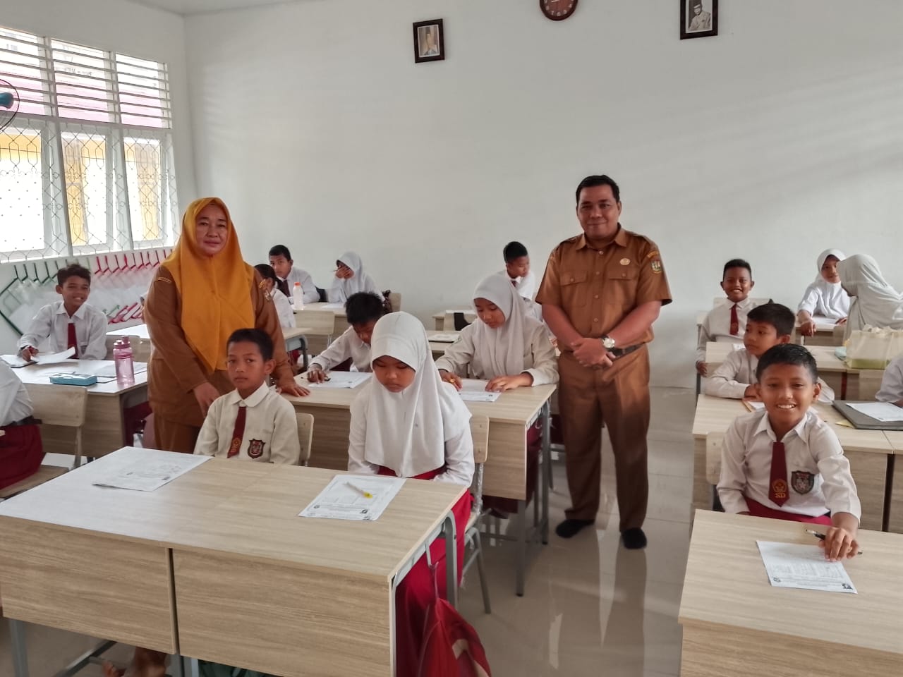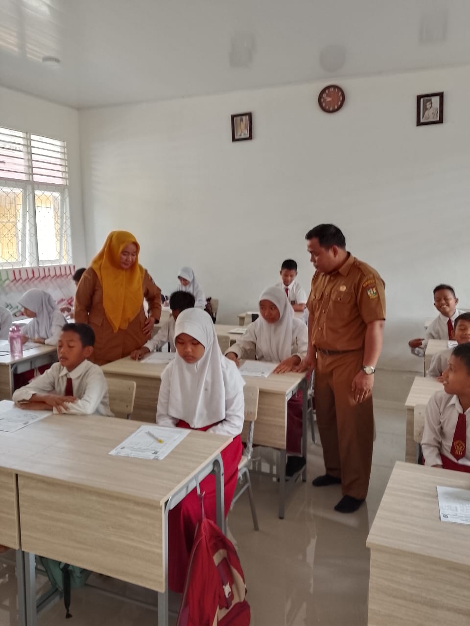 Tampak guru guru kelas masing masing dari kelas-1 hingga kelas Kelas-6 juga mengawasi para siswa siswi agar tenteram, dan jangan menyontek lembaran ujian.” Kalau tidak mengerti pertanyaan di soal bisa kedepan, dan akan bapak jelaskan pertanyaannya,” ucap Rudi Effendi, S.Pd