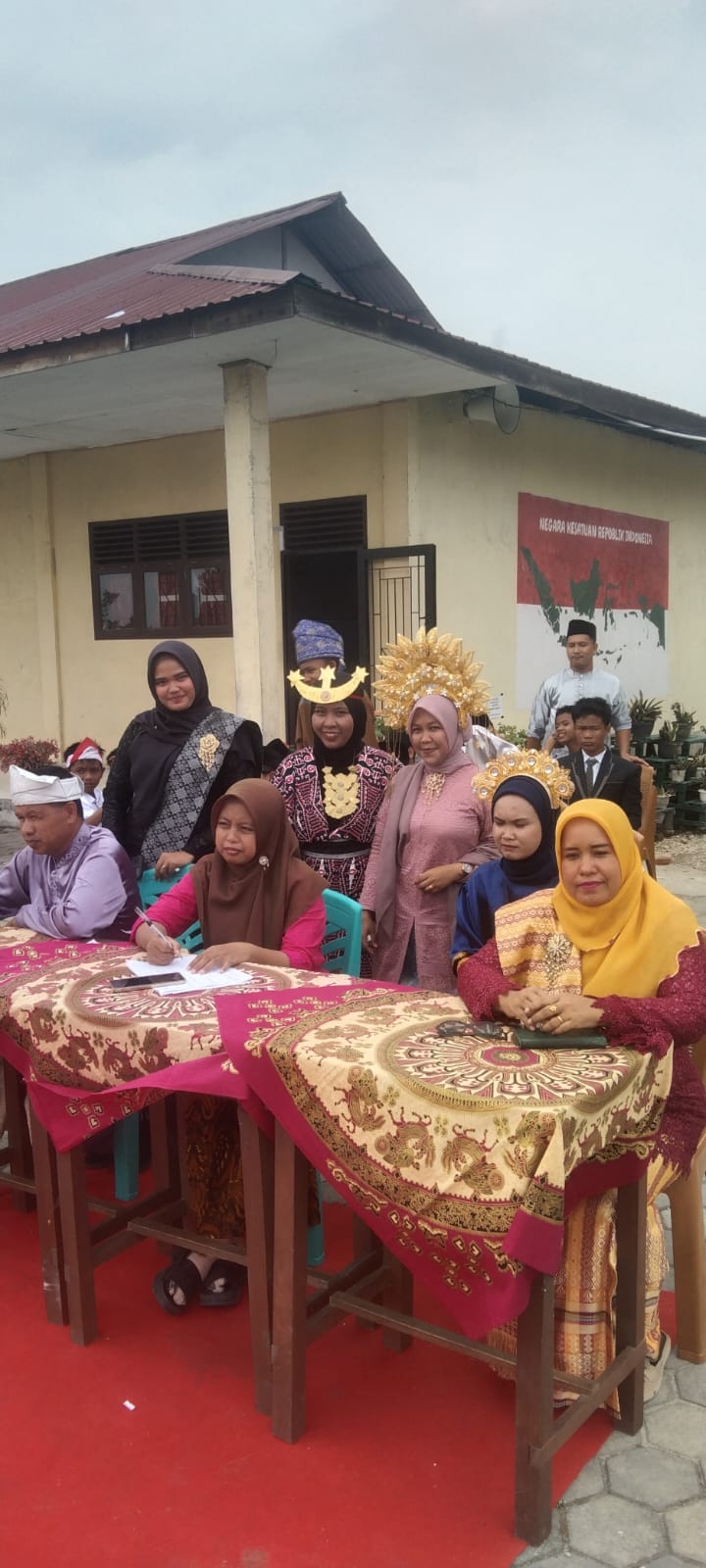 Tampak Kepala UPT SMPN 3 Perhentian Raja Yusrina, S.Pd, para majelis guru dan Staf yang akan memilih pemenang pawai berpakaian adat, ikut mengiring ratusan siswa siswi yang penuh semangat.
