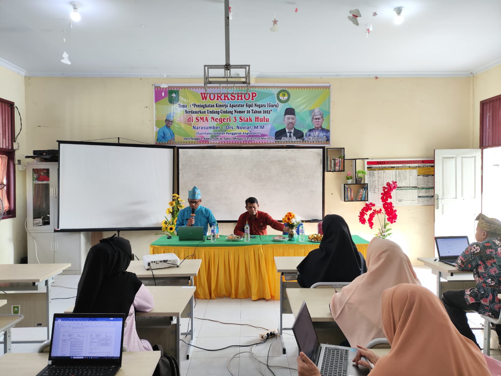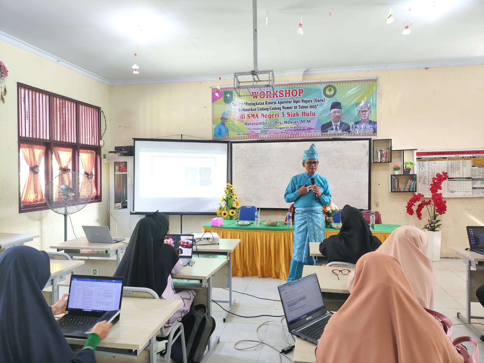 Kampar, Harimaupagi.com – Dalam hal Peningkatan Kinerja Aparatur Sipil Negara (ASN) berdasarkan UU Nomor 20 Tahun 2023. Kepala Sekolah (Kepsek) SMAN 3 Siak Hulu Agus Stiyono, S.H mengadakan Workshop dengan materi Peningkatan Kinerja Aparatur Sipil Negara (ASN) selama 2 hari, di mulai tanggal 14 dan 15 Juni 2024