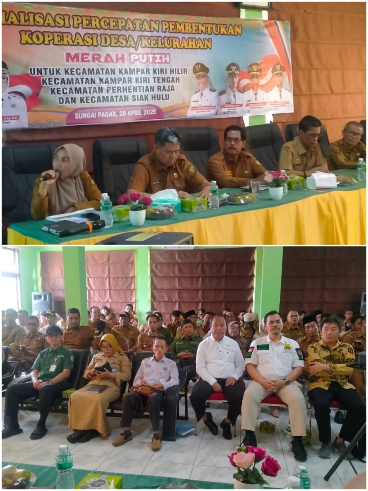 Kampar, Harimaupagi.com – Program Asta Cita Presiden RI dalam rangka mendukung program tersebut, khususnya untuk memperkuat ekonomi rakyat dan membangun Indonesia Menuju Indonesia Maju. Pemerintah kabupaten Kampar melalui Dinas Perdagangan dan Koperasi menggelar kegiatan Sosialisasi Percepatan Pembentukan Koperasi Desa/Kelurahan Merah Putih, bertempat di Aula Kantor Camat Kampar Kiri Hilir. Senin (28/4/2025)