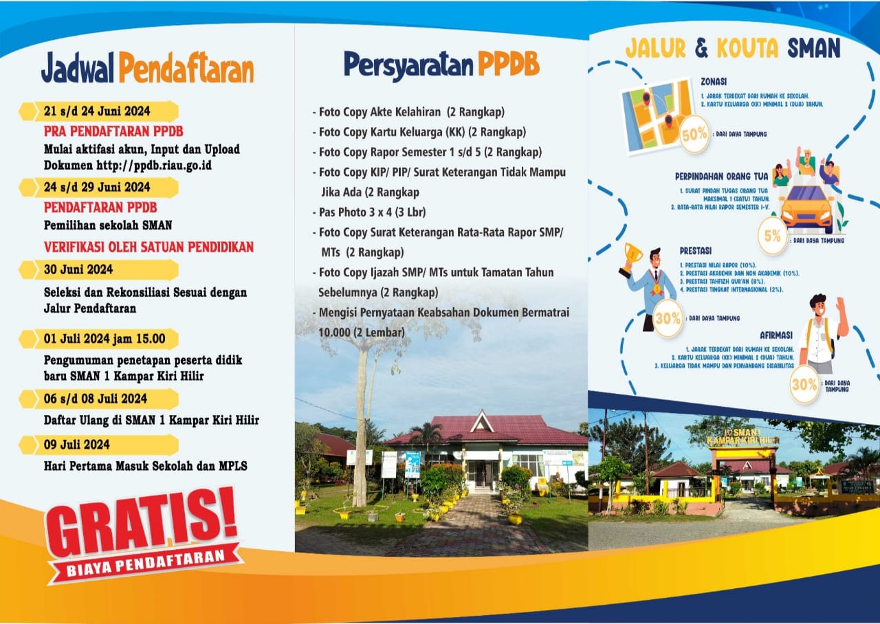 Dilanjutkan pada tanggal 24 s/d 29 Juni 2024 Pendaftaran PPDB (Pemilihan Sekolah SMAN). Tanggal 30 Juni 2024 Verifikasi oleh satuan pendidikan, Tanggal 01 Juli 2024 Pengumuman penetapan peserta didik baru SMAN 1 Kampar Kiri Hilir, Tanggal 06 Juli 2024 Daftar ulang SMAN 1 Kampar Kiri Hilir dan tanggal 09 Juli 2024 hari pertama masuk sekolah dan MPLS.