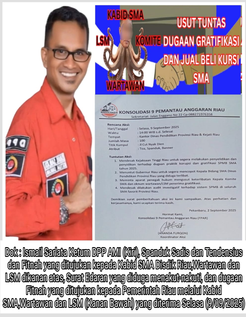 “Sungguh amat disayangkan dan kita sesalkan atas sikap seorang oknum yang diduga bernama Ananda Furqon, akan melakukan aksi di Dinas Pendidikan dengan dugaan menyebarkan surat edaran tertanggal 9 September 2025, tanpa stempel dan spanduk aksi atas nama Konsilidasi 9 Pemantau Anggaran Riau yang terkesan menakuti-nakuti dan fitnah yang ditujukan kepada profesi Wartawan dan LSM dengan memberikan 4 tuntutan kepada Gubernur Riau dan Penegak Hukum.” ucap Ismail Sarlata dalam Press rilisnya kepada Media, Rabu (10/09/2025)