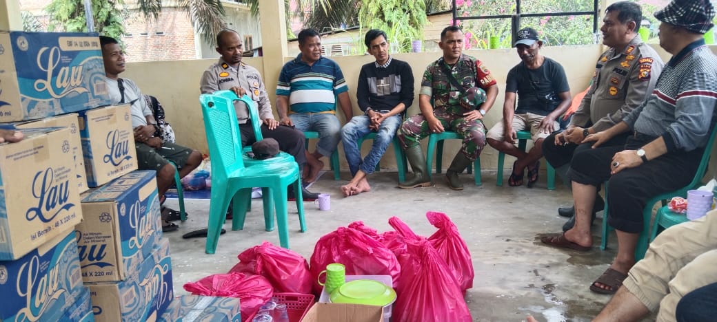 Sekira 30 menit perjalanan, pukul 12.00 Wib Tim Garda Terdepan tiba di tempat Dapur Umum dan di sambut langsung para Tim Dapur Umum dan Staf kantor Desa Buluh Cina serta puluhan masyarakat.” Mari kita angkat, ini ada bantuan 6 Paket Sembako dan 40 Dos air minuman Aqua untuk Dapur Umum,” ucap Kapolsek